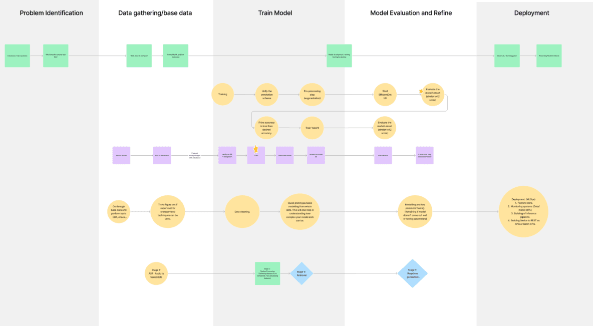 Mapping the processes of 8 different machine learning developers: problem identification, data gathering, model training, model evaluation and refinement, and deployment.